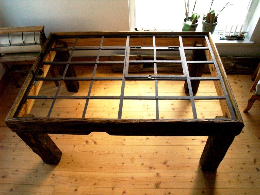 Ein altes Industriefenster (gesäubert und versiegelt) wurde in markantes Dachstuhlholz eingefasst und erhält so einen neuen Look.