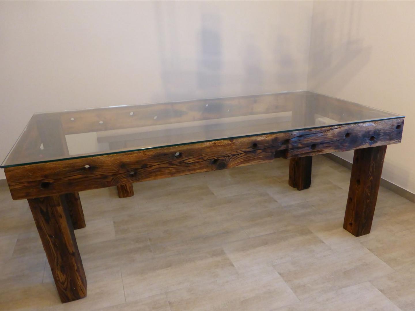 Das Holz ist 200 Jahre alte Kiefer und stammt aus einem Dachstuhl eines baufälligen historischen Gebäudes.