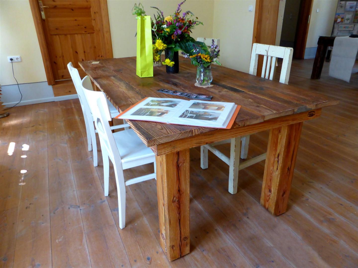...und jetzt ist es ein bezaubernder Tisch. 300 Jahre hat das Kiefernholz auf dem Buckel. Wir haben die Beine abnehmbar gestaltet, um einen Transport zu erleichtern.