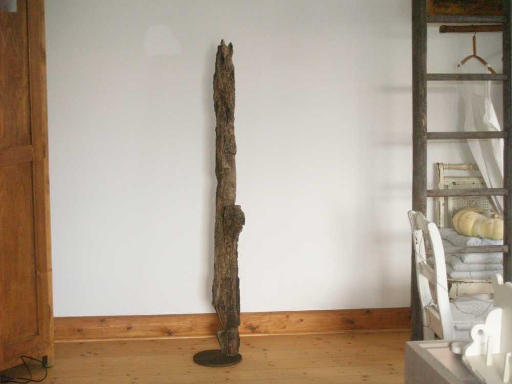 Dieses Holzobjektstück verbindet die Werkstoffe Holz und Eisen kunstvoll miteinander.