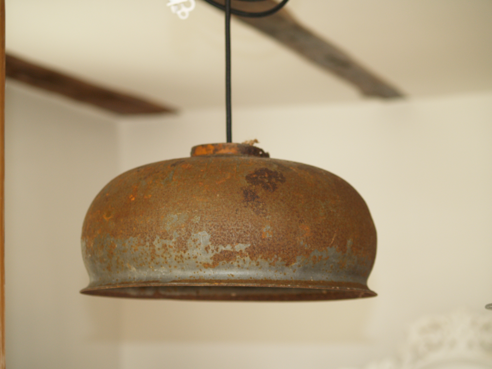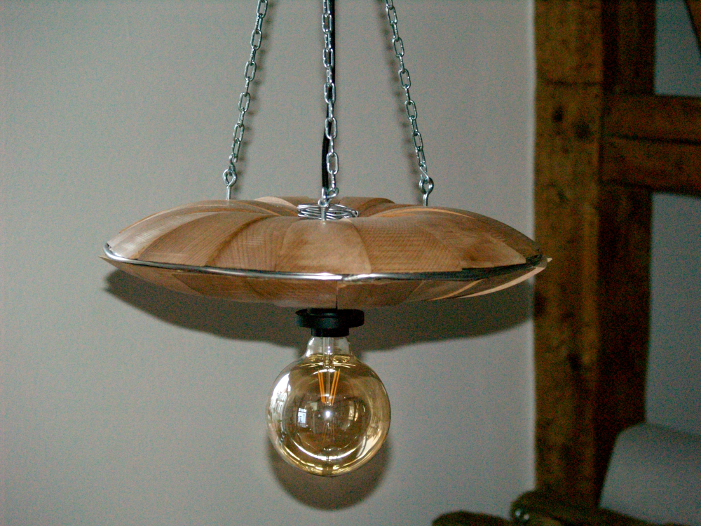 Hier eine kleinere Variante der Holzhängelampe, an Ketten aufgehängt.